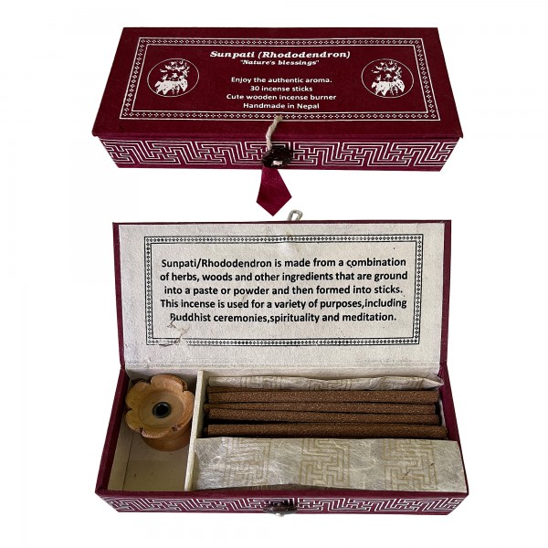 Sunpati-Rhododendron incense is made out of the combination of herbs, aromatic woods and other medicinal ingredients that are ground into a paste or powder and formed into sticks. This incense is intended to use for different purposes, including Buddhist pooja ceremonies, spirituality and meditation. The incense is 100% natural and safe, and spreads sweet scent in the environment that helps to promote the peace and relaxation.